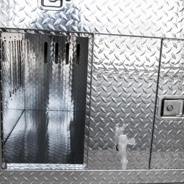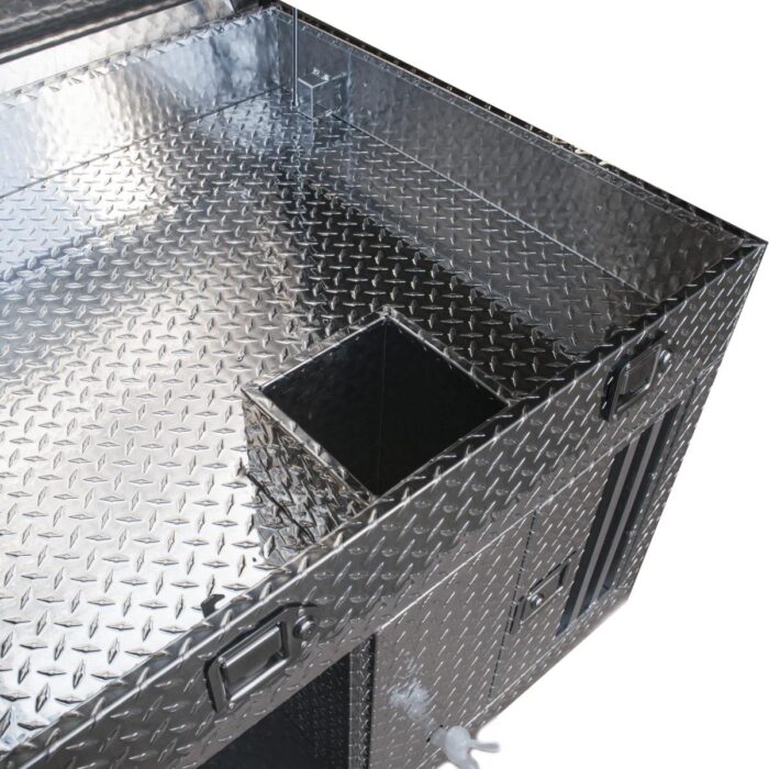 Le Coffre transport de 2 chiens 1000 x 930 x 760 mm avec réservoir est un produit de qualité supérieure, conçu pour offrir des performances exceptionnelles et une fiabilité inégalée. Fabriqué en aluminium, ce coffre de transport est spécialement conçu pour accueillir deux chiens et est équipé d’un bac à eau avec un robinet inclus. De plus, la partie supérieure du caisson offre un espace de rangement pratique.